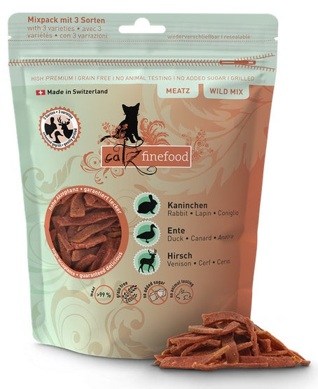 Catz Finefood Meatz Wild Mix to chrupiące paski z 100% grillowanego i suszonego mięsa z trzech gatunków: królika, kaczki i jelenia.