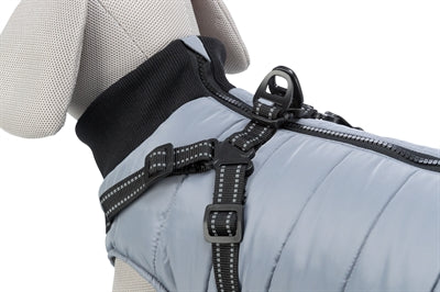 De Trixie Hondenjas Pontis Met Tuig Grijs 36 cm is een handige jas met kraag voor de hond die waterafstotend is, met een geïntegreerd tuig.