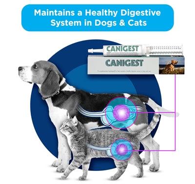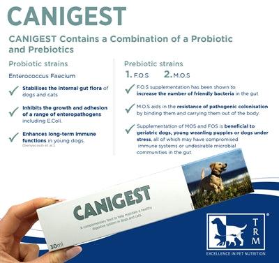 TRM Canigest 30 ml ist eine schmackhafte Paste für Hunde und Katzen, die deren Verdauung unterstützt. Die Stärke von Canigest liegt in seiner Vierfach-Wirkformel, einer leistungsstarken Mischung aus nützlichen Bakterien, die die Darmflora regenerieren. Sie enthält eine Kombination aus Probiotika, Präbiotika, Glutamin, Kaolin und Pektin, die speziell zur Unterstützung der Behandlung von Verdauungsproblemen bei Haustieren entwickelt wurde. Canigest Paste ist leicht zu dosieren und kann helfen bei: