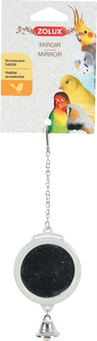 Ein lustiger Kunststoffspiegel in runder Form mit einer Glocke. Das Spielzeug lässt sich mithilfe der Eisenkette mit Clip am Ende einfach am Käfig befestigen.